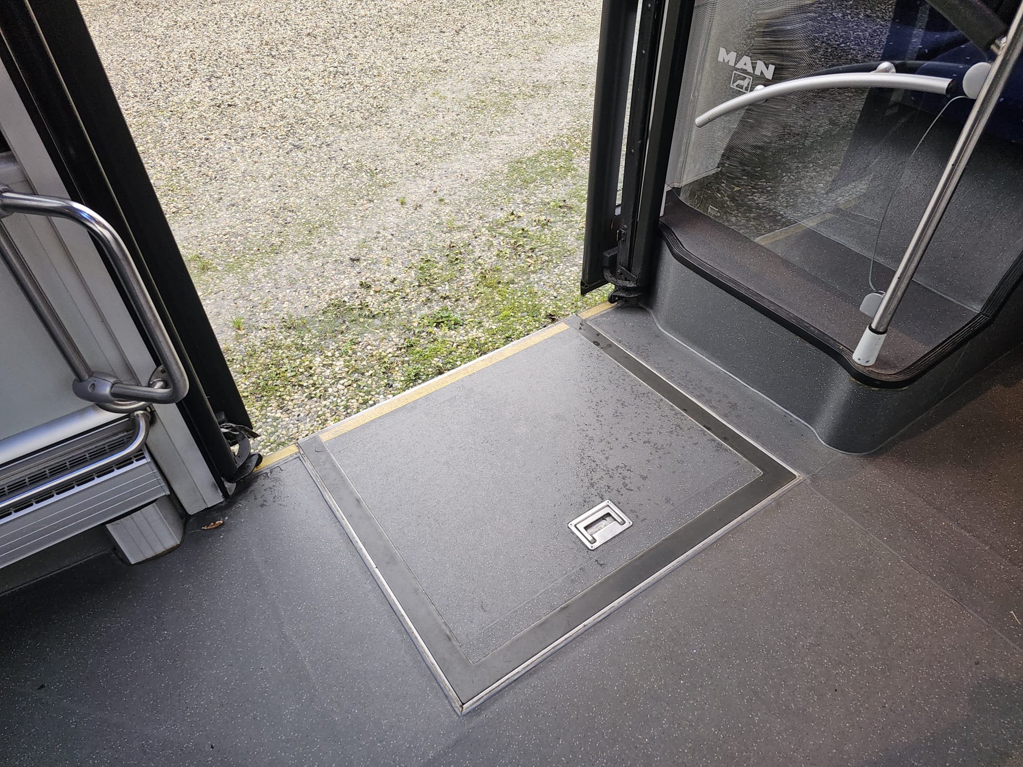 - Stehperron mit ausklappbarer RS-Rampe und 2 + 2 Notklappsitzen für ein RS oder KiWa in Türe 2